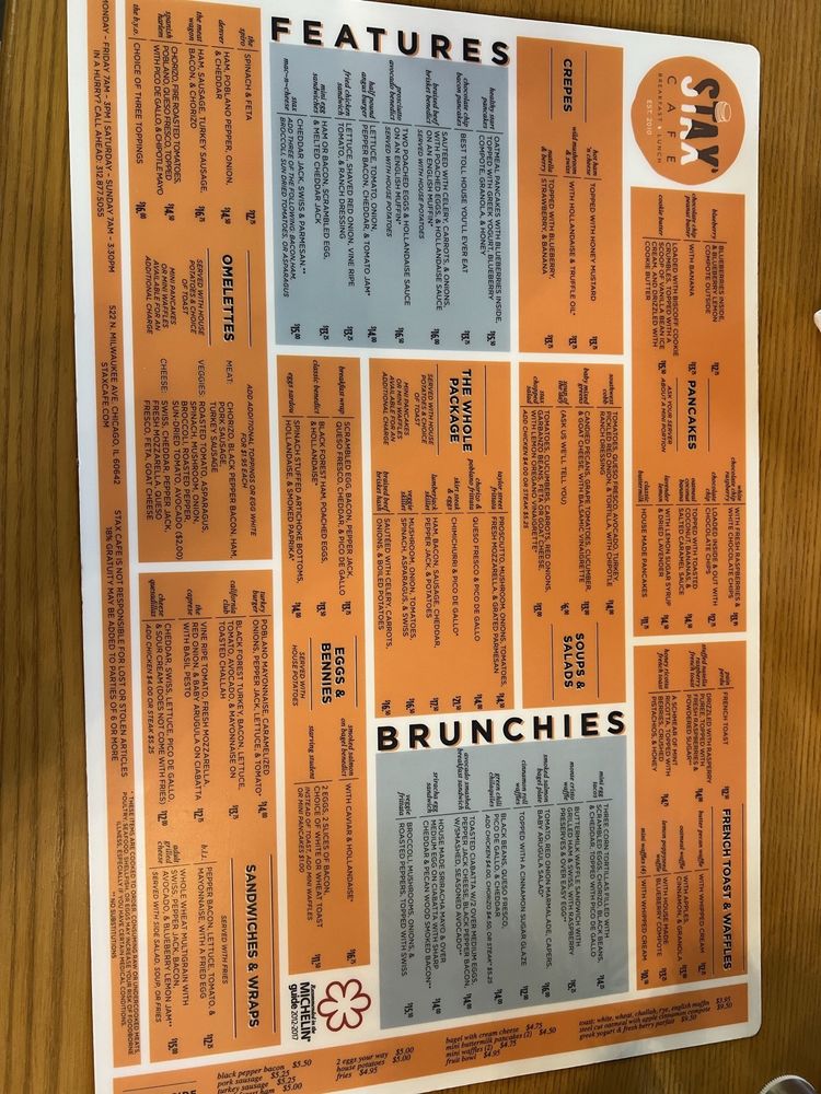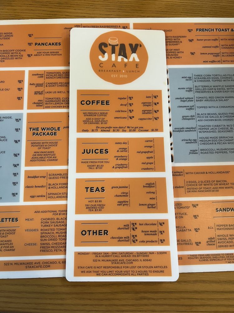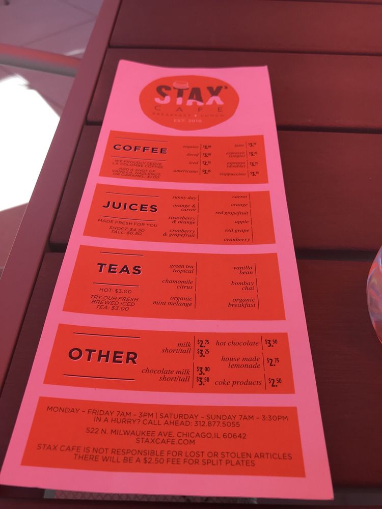 Stax Cafe, an American breakfast and brunch spot located at 522 N Milwaukee Ave in Chicago, offers a variety of dishes perfect for any time of day. With options for delivery, takeout, and reservations, Stax Cafe provides a convenient dining experience. The menu features many vegetarian options, making it a great choice for those with dietary restrictions. The casual and trendy atmosphere, along with outdoor seating and free Wi-Fi, create a welcoming environment for guests. Whether you're looking for a place to enjoy a meal with friends, family, or even your furry companion (dogs allowed), Stax Cafe has something for everyone. Don't miss out on their happy hour specials and attentive waiter service. Overall, Stax Cafe is a must-visit for those craving delicious breakfast, brunch, or lunch options in the Chicago area.